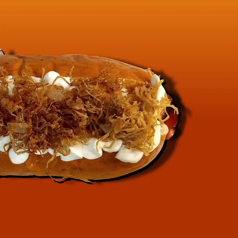 Pão brioche, linguiça, cheddar, cebola crispy e molho especial